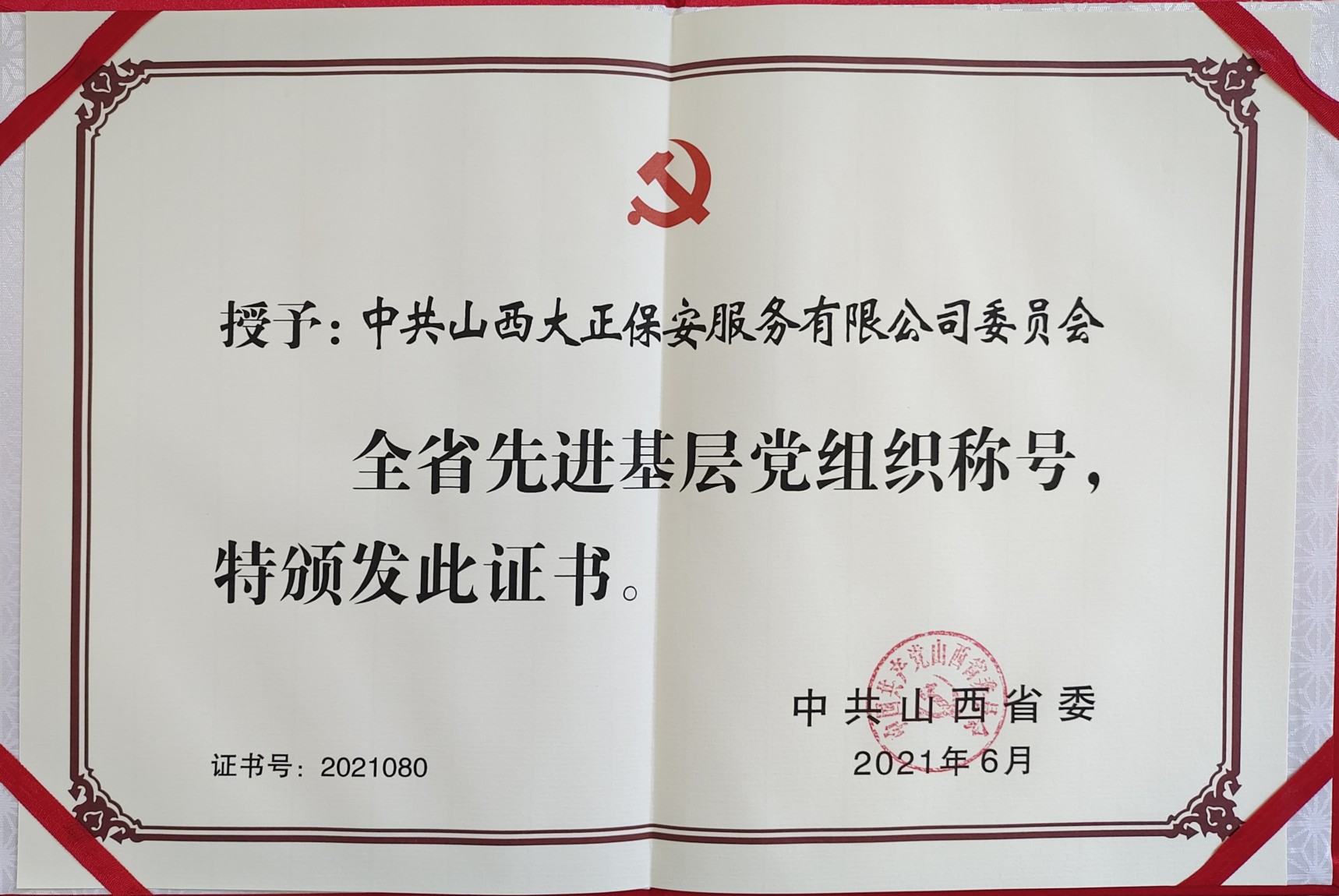 6月22日,在即將迎來中國共產(chǎn)黨百年華誕之際,山西省“兩優(yōu)一先”表彰大會在太原隆重召開。會上,中共山西大正保安服務(wù)集團有限公司委員會被中共山西省委授予“全省先進基層黨組織”榮譽稱號。會議以電視電話會議形式召開,集團公司黨委副書記、副總經(jīng)理陳志平代表集團公司黨委在忻州分會場參會并領(lǐng)取獎牌及榮譽證書。