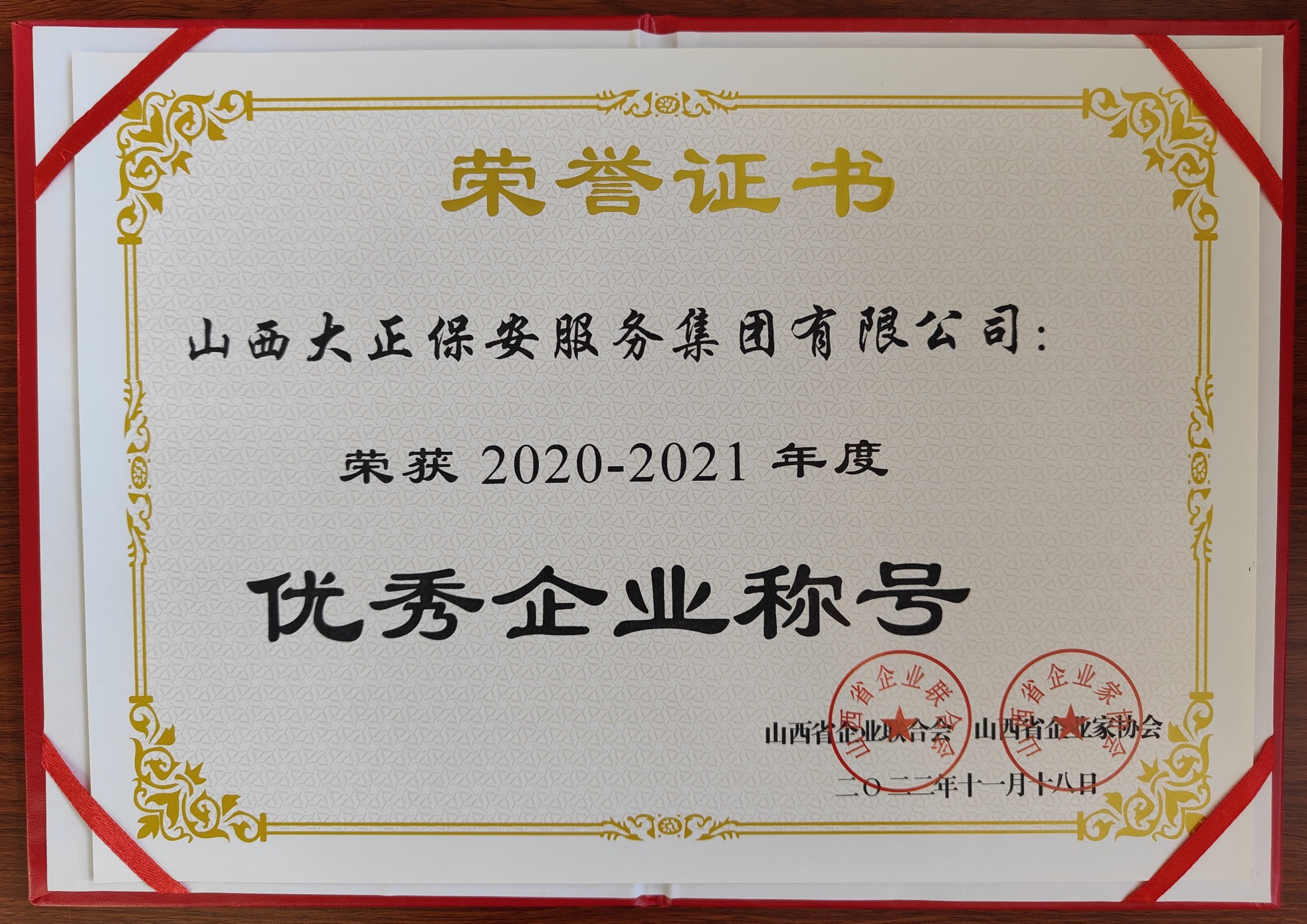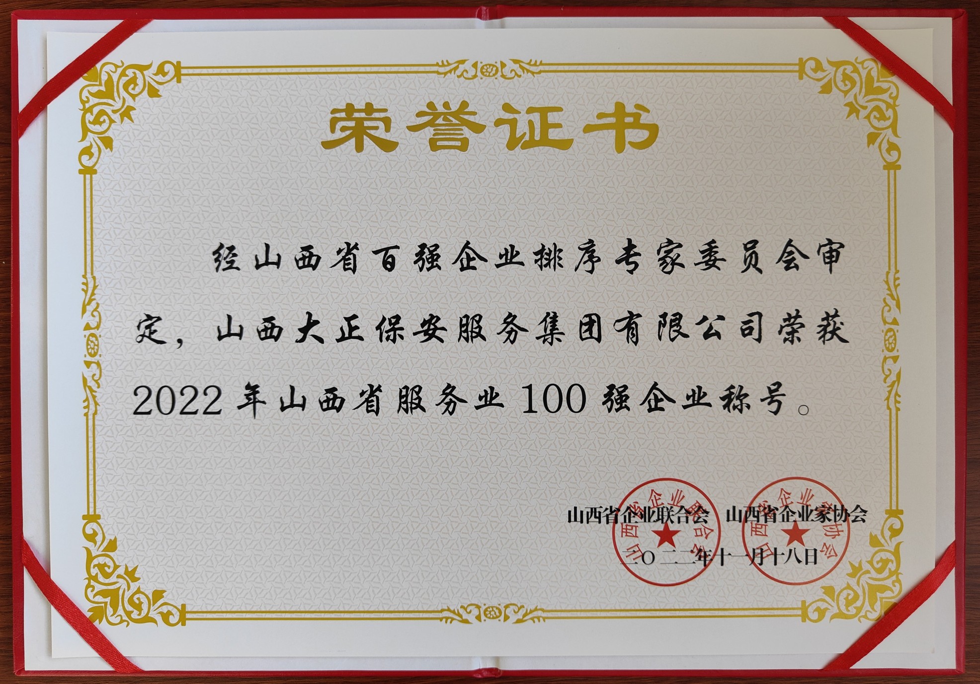 12月20日,山西省企業(yè)聯(lián)合會、山西省企業(yè)家協(xié)會召開第30次年會暨2022山西企業(yè)100強發(fā)布會。山西大正保安服務(wù)集團有限公司入圍“2022山西服務(wù)業(yè)企業(yè)100強”、榮獲“2020-2021年度優(yōu)秀企業(yè)”稱號,黨委副書記、總經(jīng)理趙培宏榮獲“2020-2021年度優(yōu)秀企業(yè)家”稱號。