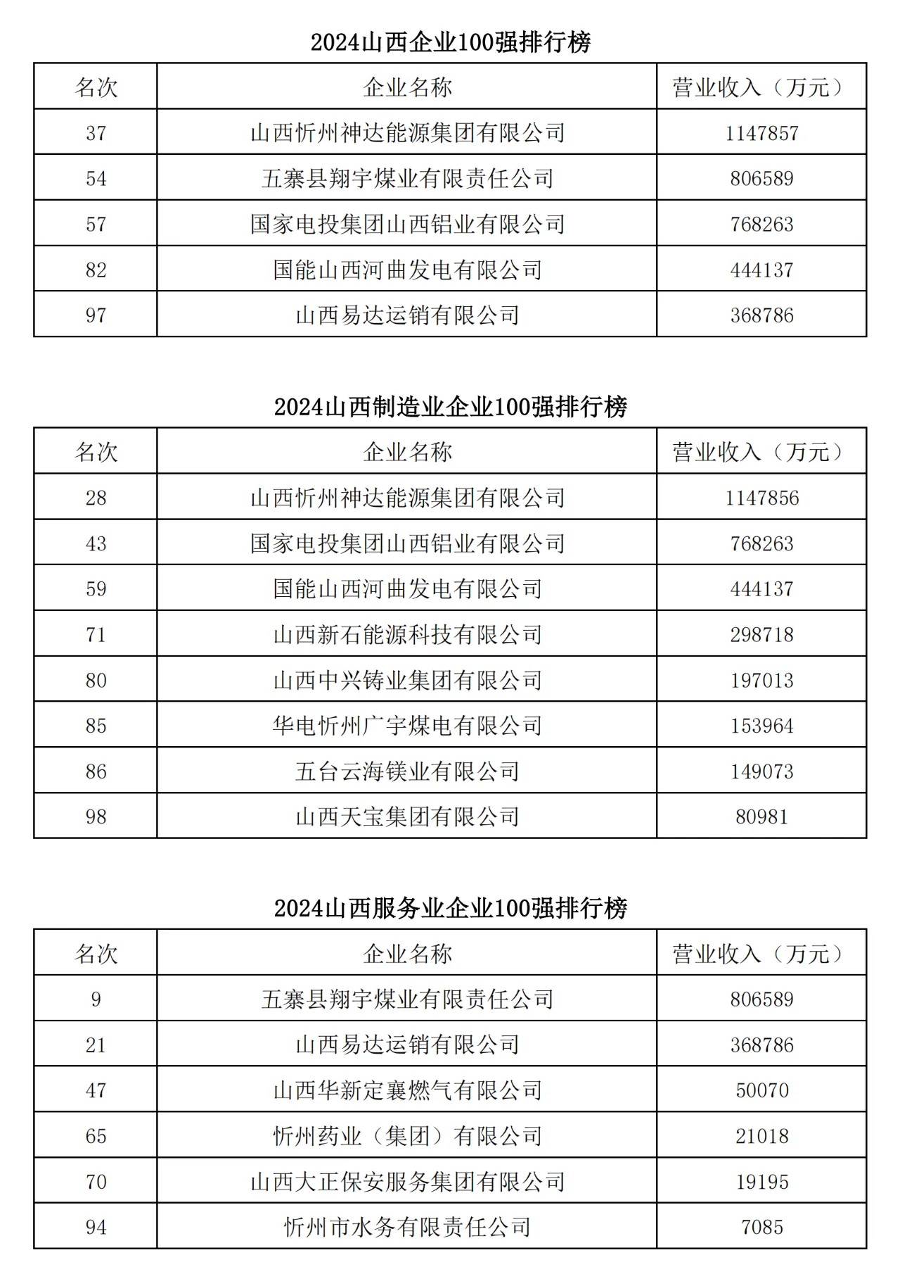 今年是山西省企業(yè)聯(lián)合會(huì)、山西省企業(yè)家協(xié)會(huì)連續(xù)第二十一年向社會(huì)發(fā)布“山西企業(yè)100強(qiáng)排行榜”,同時(shí)發(fā)布《山西企業(yè)100強(qiáng)(年度)發(fā)展報(bào)告》。2024山西企業(yè)100強(qiáng)營業(yè)收入總額26041.18億元,比上年略有降低;入圍門檻35.8億元,比上年增加了5.32億元,平均資產(chǎn)總額比上年增加了17.63%,平均凈利潤比上年增長了0.49%。晉能控股集團(tuán)有限公司以營業(yè)收入4505.2億元排名第一;山西焦煤集團(tuán)有限責(zé)任公司以營業(yè)收入2373.89億元排名第二;潞安化工集團(tuán)有限公司以營業(yè)收入1730億元排名第三。2024年山西省百強(qiáng)企業(yè)中有2家企業(yè)躋身世界企業(yè)500強(qiáng);有10家企業(yè)入圍中國企業(yè)500強(qiáng);有5家企業(yè)入圍中國制造業(yè)企業(yè)500強(qiáng);有3家企業(yè)入圍中國服務(wù)業(yè)企業(yè)500強(qiáng)。