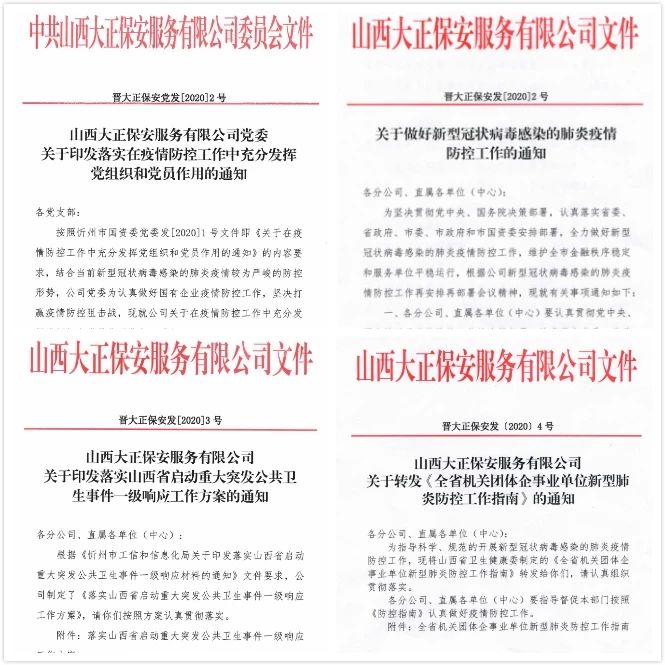 為深入貫徹習(xí)近平總書記對新型冠狀病毒感染肺炎疫情防控工作的重要指示精神,堅決落實黨中央重大決策部署及省委、市委、市國資委部署安排,山西大正保安服務(wù)(集團(tuán))有限公司印發(fā)《關(guān)于做好新型冠狀病毒感染的肺炎疫情防控工作的通知》、《山西大正保安服務(wù)有限公司關(guān)于印發(fā)落實山西省啟動重大突發(fā)公共衛(wèi)生事件一級響應(yīng)工作方案的通知》,要求公司各部門把防控疫情作為當(dāng)前最重要的工作來抓,落實落細(xì)防控措施,切實保障員工安全,保障全市金融秩序穩(wěn)定和服務(wù)單位平穩(wěn)運(yùn)行。集團(tuán)公司黨委印發(fā)了落實在疫情防控工作中充分發(fā)揮黨組織和黨員作用的通知,要求基層黨支部、全體黨員深刻認(rèn)識疫情防控形勢,全面落實我市“五嚴(yán)五防”措施,用實際行動踐行初心使命。