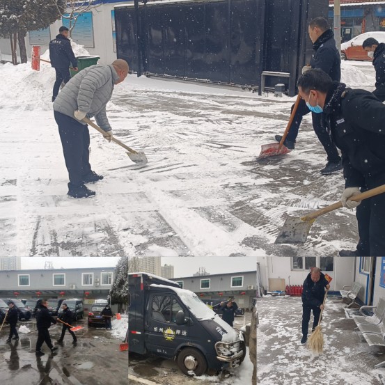 在各中隊安排早上出勤車輛有序出發(fā)后,經(jīng)理楊貴文充分發(fā)揮黨員先鋒模范作用,帶領各中隊員工齊上陣,投入到掃雪活動中,全體隊員不畏嚴寒,充分發(fā)揮了吃苦耐勞、頑強拼搏的戰(zhàn)斗精神,他們手中揮舞著鐵鍬、推鏟、掃把等勞動工具,干勁十足,經(jīng)過幾小時的努力,押運車輛、公司院內及周邊道路的積雪全部清理干凈,保障了人員車輛的出行安全,為城區(qū)守押金融業(yè)務穩(wěn)定有序運行提供了強有力的安全保障。