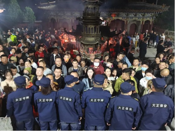 凌晨0點過后,車流量、人流量逐步增多,還愿、許愿香客絡(luò)繹不絕,執(zhí)勤隊員一邊要維持秩序,一邊還要檢查是否攜帶香火蠟燭燈等易燃物品進入寺廟。凌晨0時直到次日中午12時在長達 24個小時的時間里,公司帶隊領(lǐng)導(dǎo)和隊員們始終堅守在一線,充分體現(xiàn)了大正保安人紀律嚴明、吃苦耐勞、能打硬仗、團結(jié)一致的優(yōu)良作風(fēng)。執(zhí)勤中,全體保安隊員堅守崗位、履職盡責(zé)、文明執(zhí)勤,維持秩序、服務(wù)群眾,營造了安全祥和的氣氛,圓滿完成了此次廟會安;顒樱故玖藝蟊0矊I(yè)水準和良好的精神風(fēng)貌。