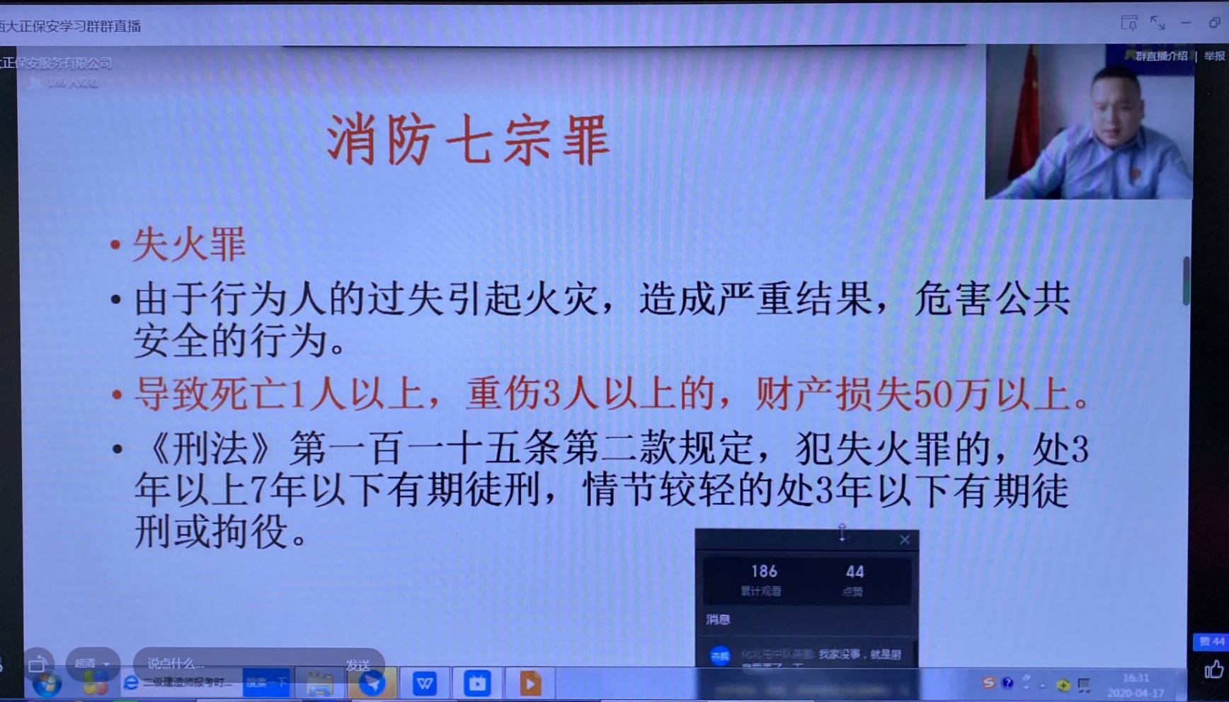 為響應(yīng)國(guó)家號(hào)召,貫徹“預(yù)防為主,防消結(jié)合”的方針,做到科學(xué)應(yīng)對(duì),力求人人講安全,人人會(huì)安全。4月17日,公司特邀山西陽光眾安消防科技有限公司忻州分公司講師黃前對(duì)我公司員工進(jìn)行線上安全教學(xué)。公司機(jī)關(guān)干部、全體黨員等200余人參加。