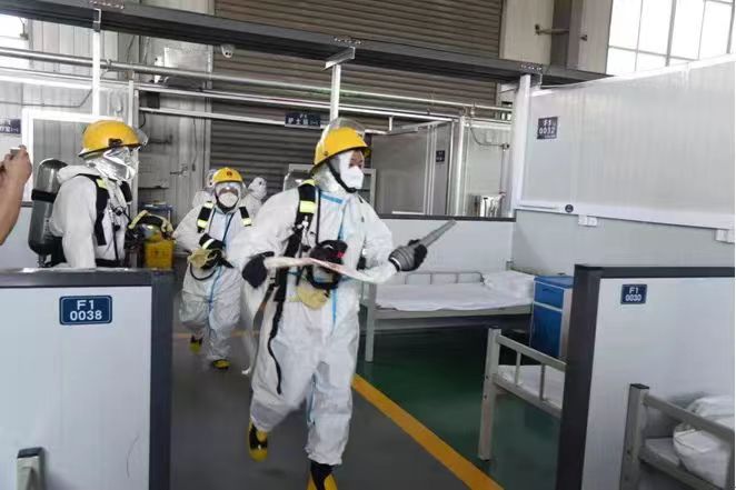 上午8點(diǎn)30分,隊(duì)員們準(zhǔn)時(shí)抵達(dá)忻州市方艙醫(yī)院,對(duì)方艙醫(yī)院滅火器、水閥、消防槍頭、消防水帶等所有消防設(shè)施進(jìn)行了全面的檢查。在炎炎夏日30度的高溫天氣下,隊(duì)員們不僅穿著消防服,還需加套醫(yī)用防護(hù)服,每次穿著脫下來(lái)時(shí)都是汗流浹背把衣服都浸濕了,但隊(duì)員們一次又一次的努力掌握如何正確、快速完成穿著練習(xí),大家不急不躁,情緒始終高漲。