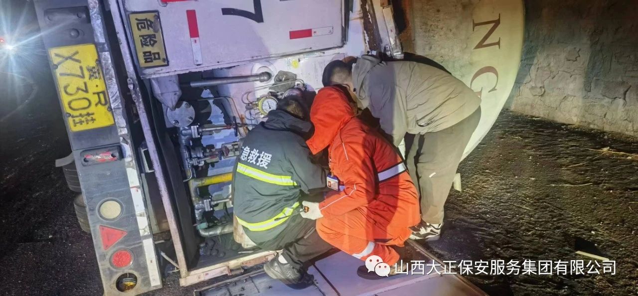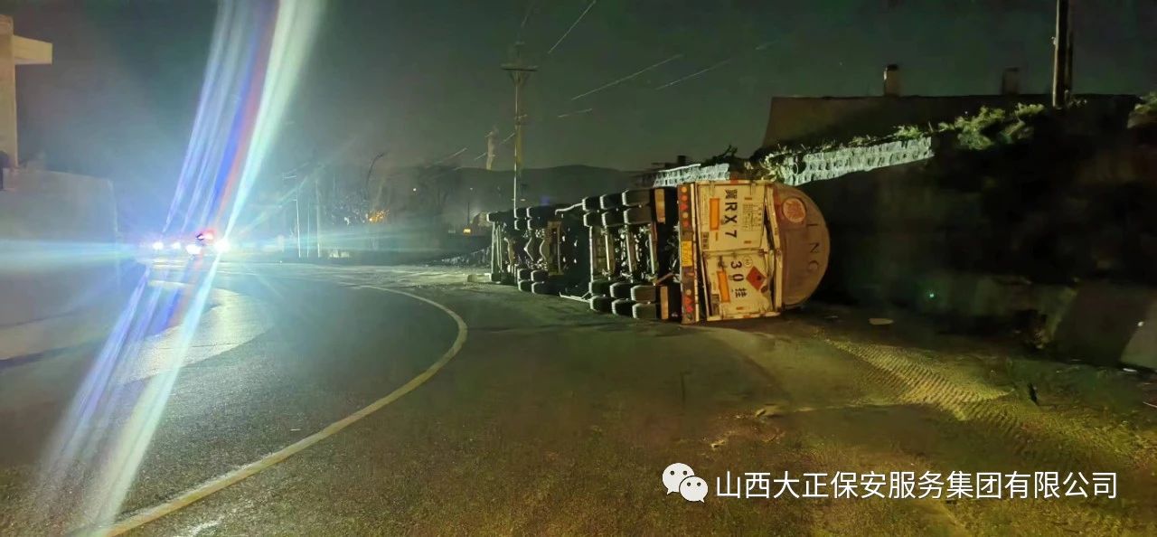 2023年11月23日晚8時(shí),山西大正保安集團(tuán)公司保德縣守押中隊(duì)?wèi)?yīng)急救援大隊(duì)接到應(yīng)急局出勤指令,棗林坡有滿載液化氣罐車(chē)發(fā)生側(cè)翻,需要派出應(yīng)急人員控制現(xiàn)場(chǎng),并協(xié)助處理側(cè)翻事故。應(yīng)急救援大隊(duì)接到命令后,派出應(yīng)急車(chē)輛兩部及應(yīng)急人員5人趕赴現(xiàn)場(chǎng),協(xié)助交警對(duì)現(xiàn)場(chǎng)路段進(jìn)行管控,保證周?chē)?chē)輛人員安全。