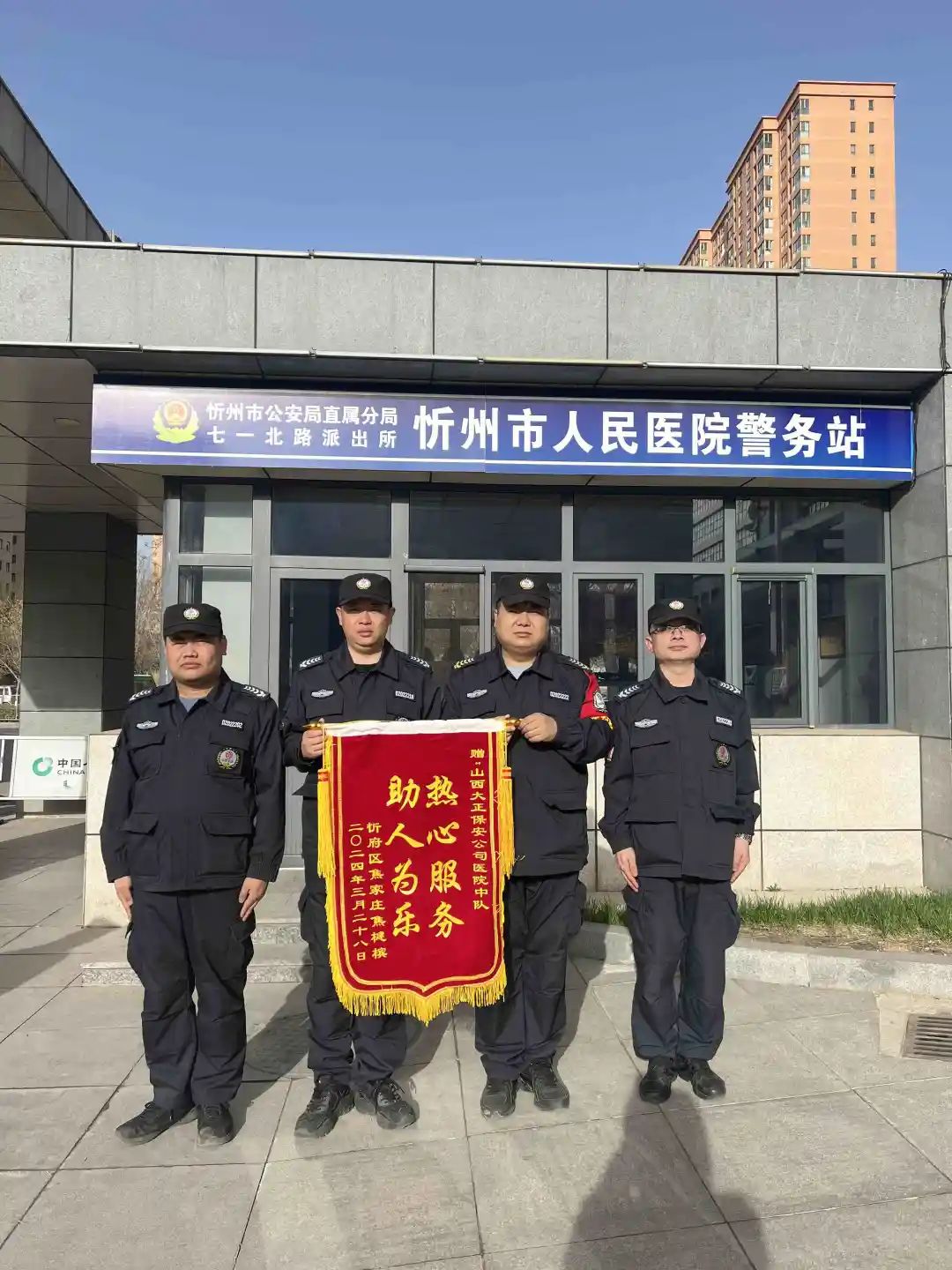 山西大正集團(tuán)忻州市保安服務(wù)公司市人民醫(yī)院駐勤點(diǎn)中隊(duì)在嚴(yán)守崗位職責(zé)外,一直有一個(gè)信念——助人為樂(lè)、幸福自己。幾年來(lái),他們的這一信念早已化作每一個(gè)駐勤點(diǎn)隊(duì)員的自覺(jué)行動(dòng),醫(yī)院哪里有異常情況就會(huì)有山西大正隊(duì)員威武的身影。