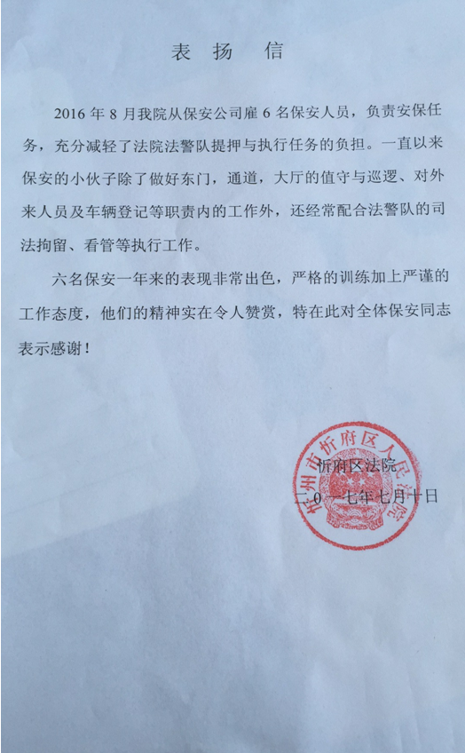 這封表揚信既是忻府區(qū)法院對特勤支隊駐法院中隊日常工作的認(rèn)可,更是對我支隊工作的肯定。它極大的鼓舞了大家的工作熱情,增強了大家做好工作的信心,同時也給其它中隊做了一個表率作用。