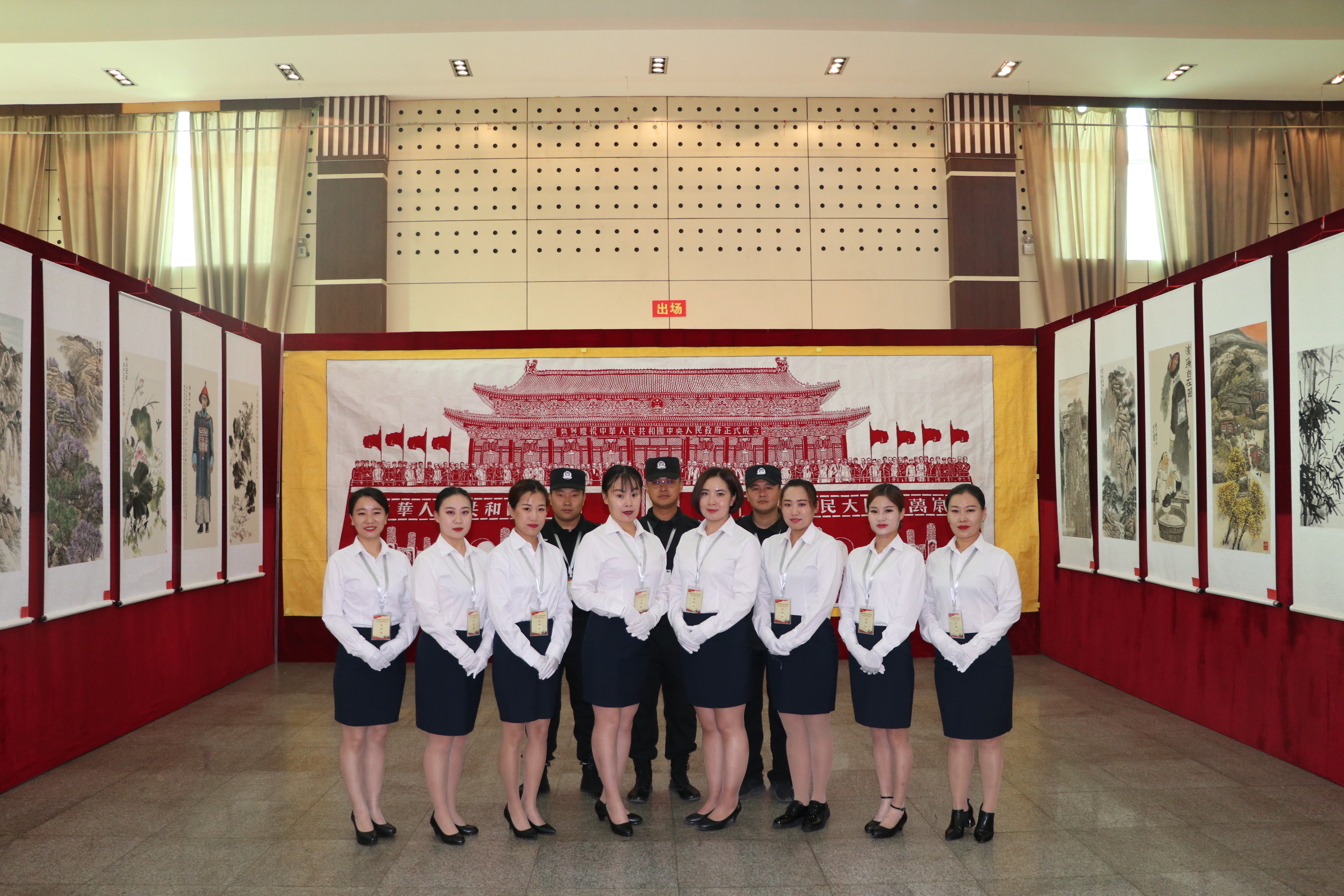 此次巡展意義非凡,文化藝術(shù)公司更是嚴(yán)陣以待。9月19號(hào)到黨校進(jìn)行為期4天的會(huì)場(chǎng)布置,在男隊(duì)員外出勤務(wù),隊(duì)里沒有男隊(duì)員的情況下,女隊(duì)員們充當(dāng)搬卸工,實(shí)木的桌椅又大又沉,女隊(duì)員們喊著號(hào)子,堅(jiān)持著硬是搬了200余張桌子,千余把椅子,四天里搬桌椅協(xié)助男隊(duì)員搭桁架,掛展出的作品,隨處都有女隊(duì)員的身影。巡展現(xiàn)場(chǎng),8名女隊(duì)員負(fù)責(zé)禮儀引導(dǎo),微笑服務(wù),在場(chǎng)的領(lǐng)導(dǎo)紛紛為我們的女隊(duì)員豎起大拇指。